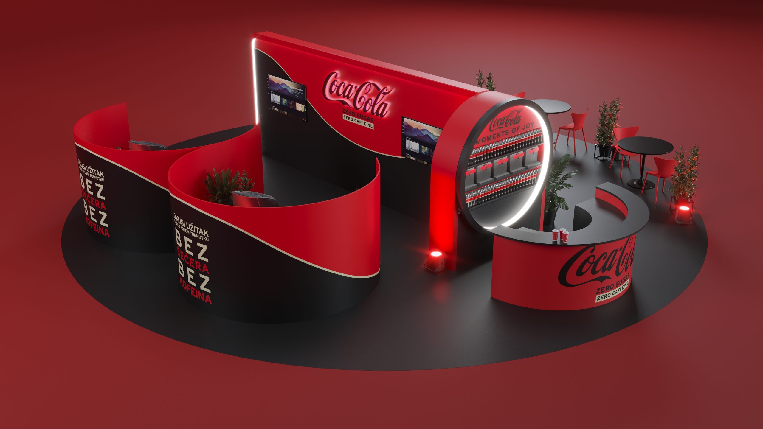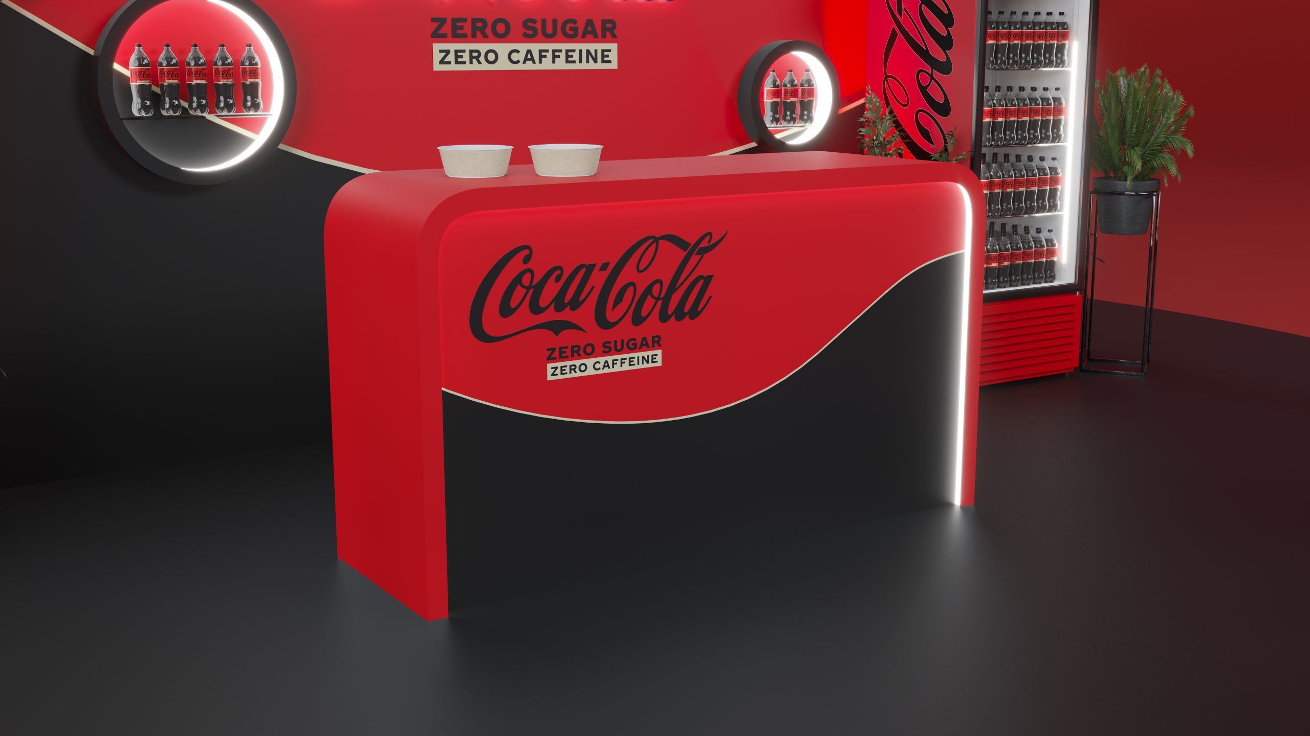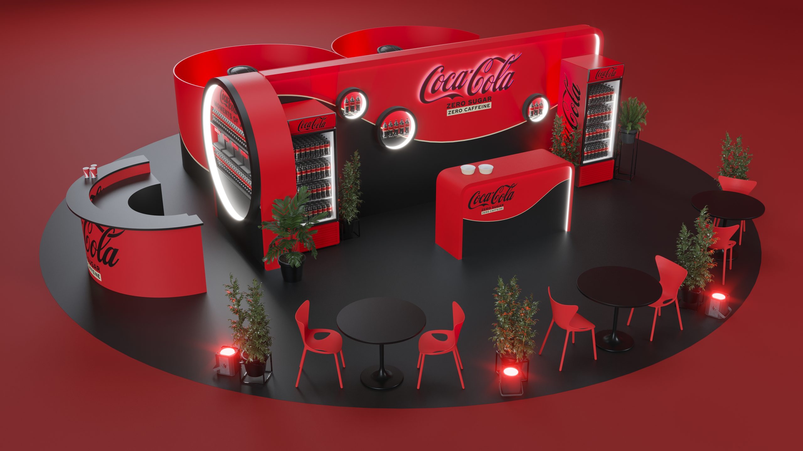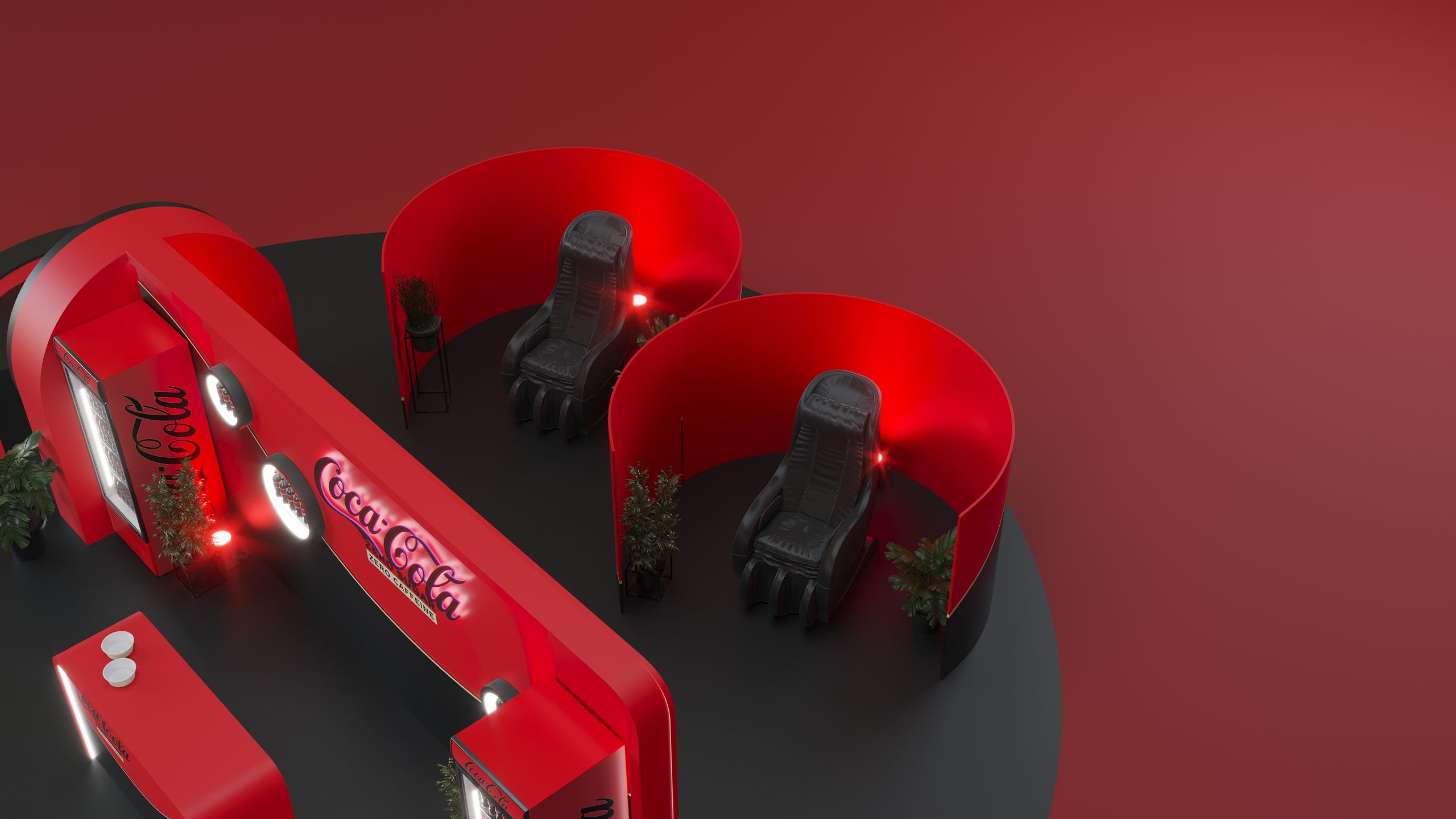 Designed to promote Coca-Cola’s Zero Zero, this booth captures the essence of refreshment and modernity. The sleek red and black design, complemented by illuminated signage and comfortable seating areas, creates an inviting atmosphere for visitors. The layout includes product displays, interactive screens, and relaxing zones to enhance the visitor experience. Our visualization showcases the booth’s engaging design, aimed at providing a memorable and enjoyable experience while highlighting the benefits of Coca-Cola Zero Zero.