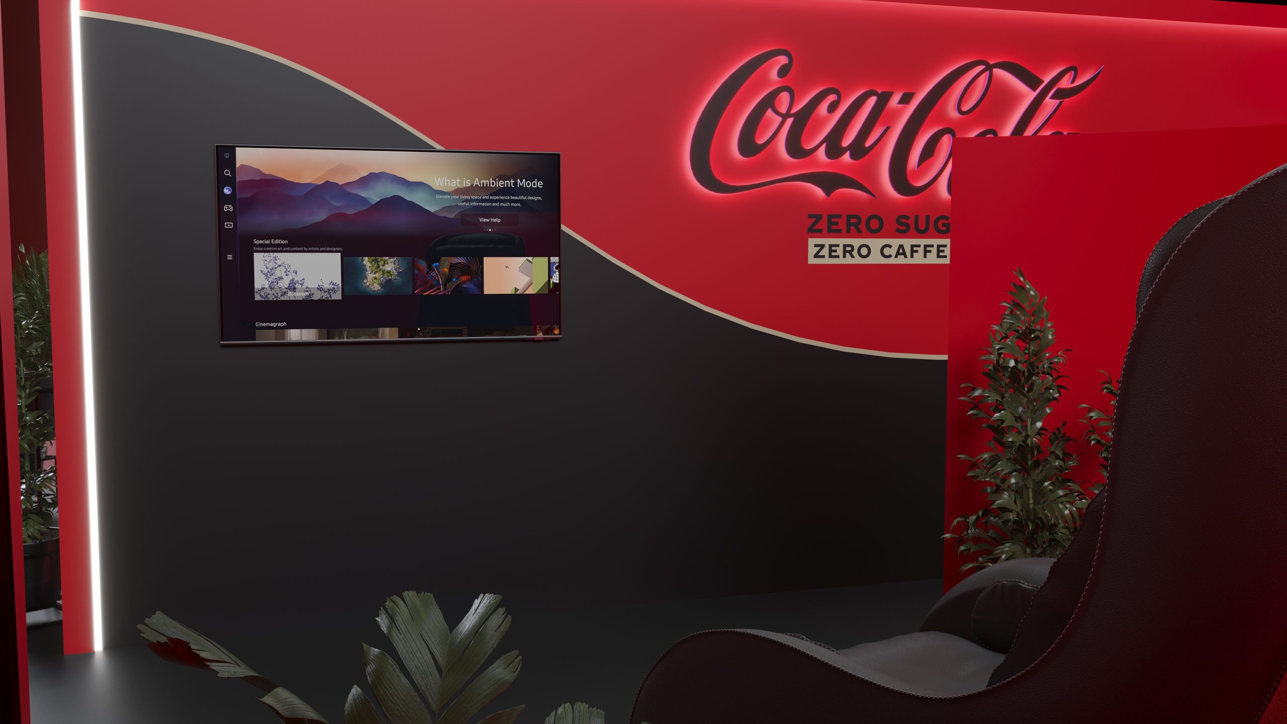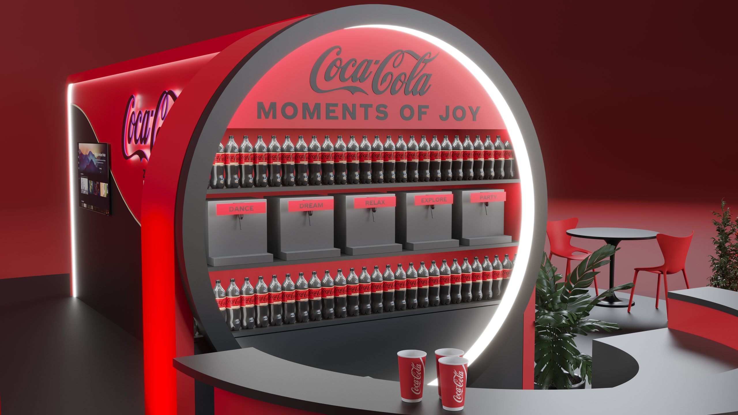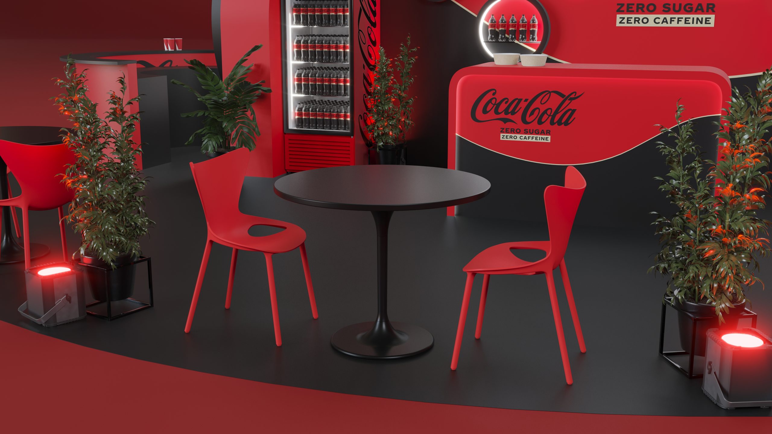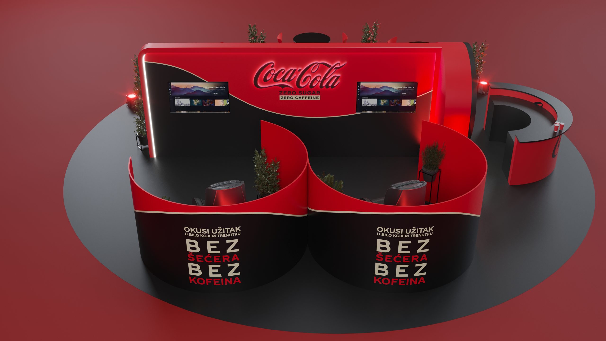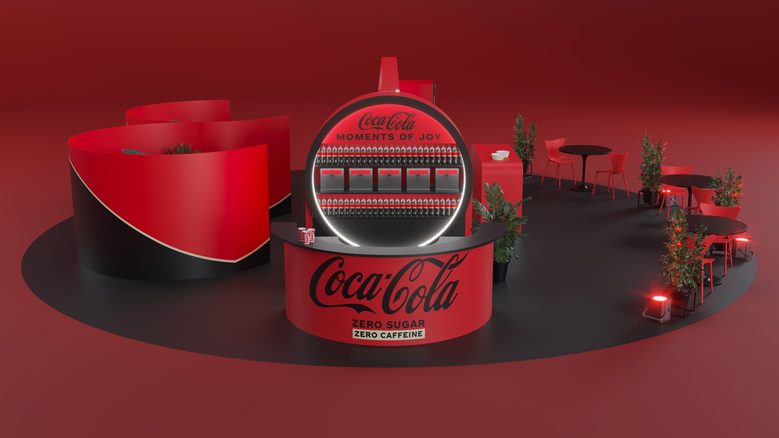 Designed to promote Coca-Cola’s Zero Zero, this booth captures the essence of refreshment and modernity. The sleek red and black design, complemented by illuminated signage and comfortable seating areas, creates an inviting atmosphere for visitors. The layout includes product displays, interactive screens, and relaxing zones to enhance the visitor experience. Our visualization showcases the booth’s engaging design, aimed at providing a memorable and enjoyable experience while highlighting the benefits of Coca-Cola Zero Zero.