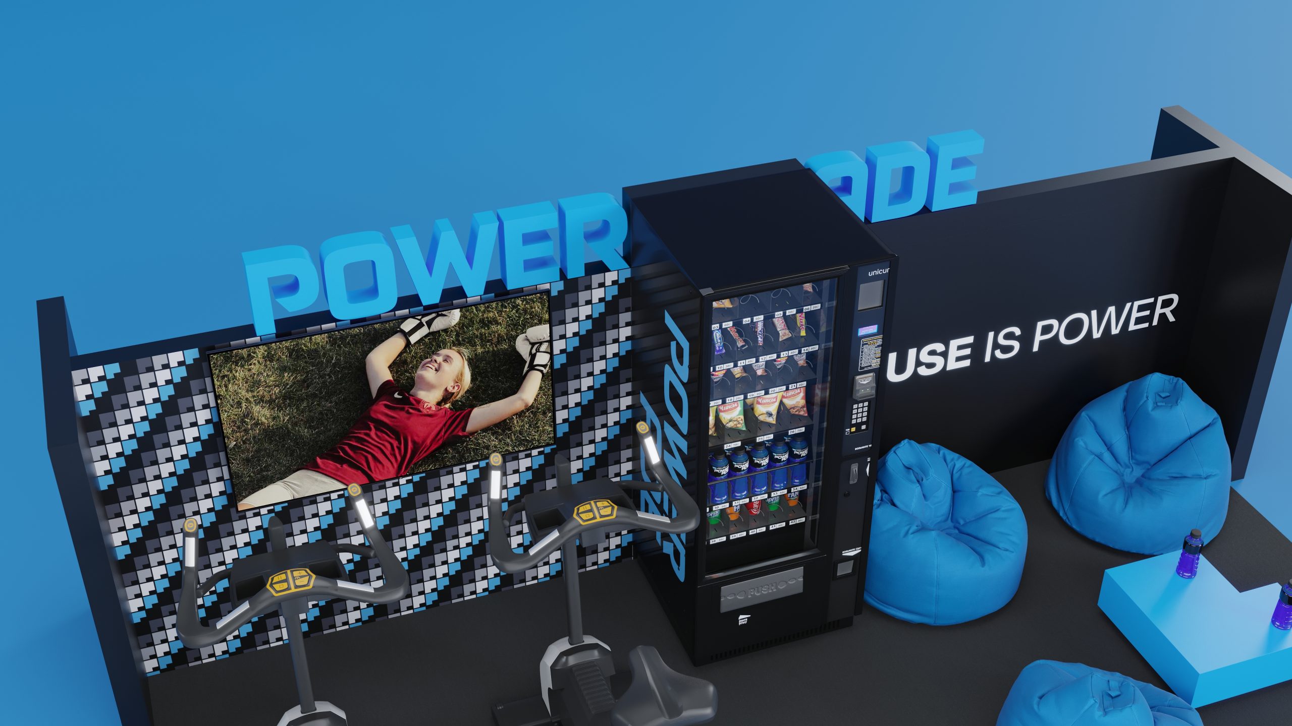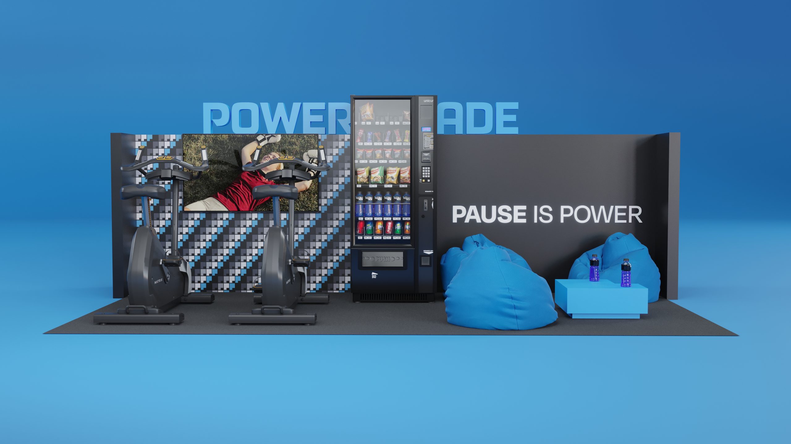 Featuring a prominent Powerade logo, interactive exercise bikes, a stocked vending machine, and a relaxation area with bean bags, this visualization highlights the brand’s message “Pause is Power.” This project showcases our expertise in creating detailed, interactive, and visually appealing 3D environments for brand engagement.